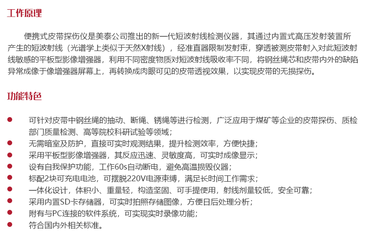 便攜式皮帶探傷儀是美泰公司推出的新一代短波射線檢測儀器,其通過內(nèi)置式高壓發(fā)射裝置所產(chǎn)生的短波射線(光譜學(xué)上類似于天然X射線),經(jīng)準(zhǔn)直器限制發(fā)射束,穿透被測皮帶射入對此短波射線敏感的平板型影像增強(qiáng)器,利用不同密度物質(zhì)對短波射線吸收率不同,將鋼絲繩芯和皮帶內(nèi)外的缺陷異常成像于像增強(qiáng)器屏幕上,再轉(zhuǎn)換成肉眼可見的皮帶透視效果,以實(shí)現(xiàn)皮帶的無損探傷。