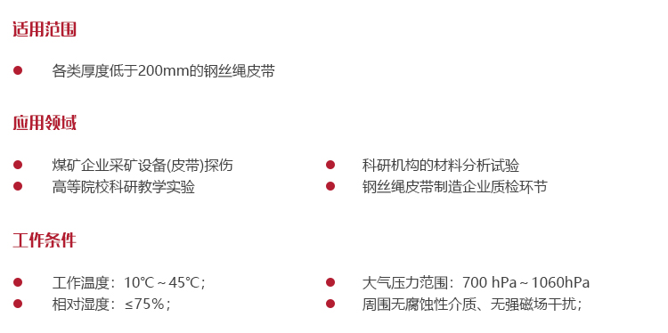 可針對皮帶中鋼絲繩的抽動、斷繩、銹繩等進(jìn)行檢測,廣泛應(yīng)用于煤礦等企業(yè)的皮帶探傷、質(zhì)檢部門質(zhì)量檢測、高等院??蒲性囼?yàn)等領(lǐng)域;