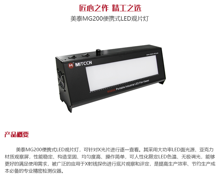 美泰MG200便攜式LED觀片燈,可針對(duì)X光片進(jìn)行逐一查看。其采用大功率LED面光源、亞克力材質(zhì)觀察屏,性能穩(wěn)定、構(gòu)造堅(jiān)固、均勻度高、操作簡(jiǎn)單,可人性化限定LED色溫、無極調(diào)光,能夠更好的滿足使用需求,被廣泛的應(yīng)用于X射線探傷進(jìn)行底片觀察和評(píng)定,是提高生產(chǎn)效率、節(jié)約生產(chǎn)成本必備的專業(yè)精密檢測(cè)儀器。