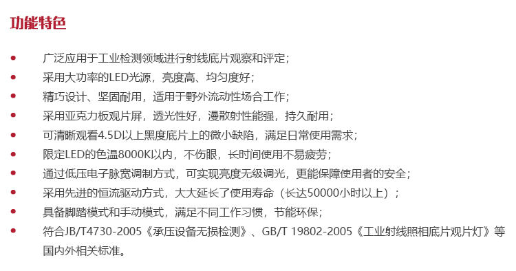 符合JB/T4730-2005《承壓設(shè)備無損檢測(cè)》、GB/T 19802-2005《工業(yè)射線照相底片觀片燈》等國內(nèi)外相關(guān)標(biāo)準(zhǔn)。