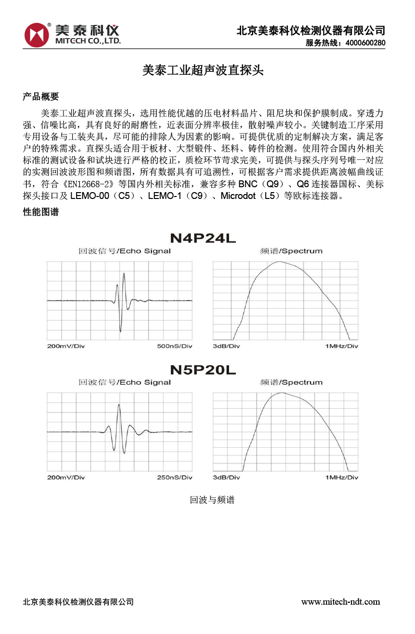美泰工業(yè)超聲波直探頭,選用性能優(yōu)越的壓電材料晶片、阻尼塊和保護膜制成。穿透力強、信噪比高,具有良好的耐磨性,近表面分辨率極佳,散射噪聲較小。關(guān)鍵制造工序采用專用設備與工裝夾具,盡可能的排除人為因素的影響??商峁﹥?yōu)質(zhì)的定制解決方案,滿足客戶的特殊需求。直探頭適合用于板材、大型鍛件、坯料、鑄件的檢測。使用符合國內(nèi)外相關(guān)標準的測試設備和試塊進行嚴格的校正,質(zhì)檢環(huán)節(jié)苛求完美,可提供與探頭序列號唯一對應的實測回波波形圖和頻譜圖,所有數(shù)據(jù)具有可追溯性,可根據(jù)客戶需求提供距離波幅曲線證書,符合《EN12668-2》等國內(nèi)外相關(guān)標準,兼容多種BNC(Q9)、Q6連接器國標、美標探頭接口及LEMO-00(C5)、LEMO-1(C9)、Microdot(L5)等歐標連接器。