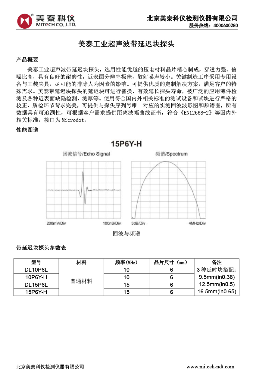 美泰工業(yè)超聲波帶延遲塊探頭,選用性能優(yōu)越的壓電材料晶片精心制成,穿透力強、信噪比高,具有良好的耐磨性,近表面分辨率極佳,散射噪聲較小。關(guān)鍵制造工序采用專用設(shè)備與工裝夾具,盡可能的排除人為因素的影響??商峁﹥?yōu)質(zhì)的定制解決方案,滿足客戶的特殊需求。美泰帶延遲塊探頭的延遲塊可進行替換,有效延長探頭壽命,被廣泛的應(yīng)用薄件檢測及各種近表面缺陷檢測,測厚等。使用符合國內(nèi)外相關(guān)標(biāo)準(zhǔn)的測試設(shè)備和試塊進行嚴(yán)格的校正,質(zhì)檢環(huán)節(jié)苛求完美,可提供與探頭序列號唯一對應(yīng)的實測回波波形圖和頻譜圖,所有數(shù)據(jù)具有可追溯性,可根據(jù)客戶需求提供距離波幅曲線證書,符合《EN12668-2》等國內(nèi)外相關(guān)標(biāo)準(zhǔn),接口為Microdot。