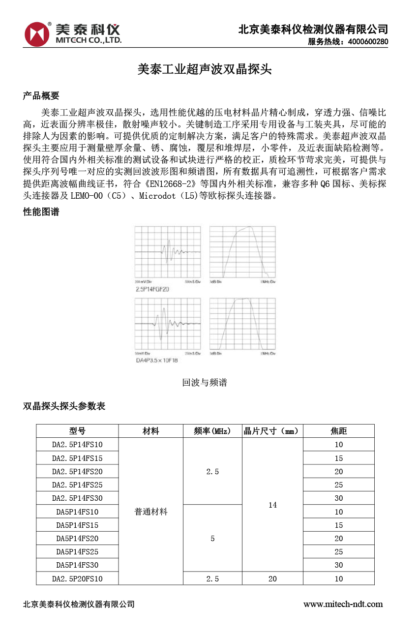 美泰工業(yè)超聲波雙晶探頭,選用性能優(yōu)越的壓電材料晶片精心制成,穿透力強、信噪比高,近表面分辨率極佳,散射噪聲較小。關鍵制造工序采用專用設備與工裝夾具,盡可能的排除人為因素的影響。可提供優(yōu)質的定制解決方案,滿足客戶的特殊需求。美泰超聲波雙晶探頭主要應用于測量壁厚余量、銹、腐蝕,覆層和堆焊層,小零件,及近表面缺陷檢測等。使用符合國內外相關標準的測試設備和試塊進行嚴格的校正,質檢環(huán)節(jié)苛求完美,可提供與探頭序列號唯一對應的實測回波波形圖和頻譜圖,所有數據具有可追溯性,可根據客戶需求提供距離波幅曲線證書,符合《EN12668-2》等國內外相關標準,兼容多種Q6國標、美標探頭連接器及LEMO-00(C5)、Microdot(L5)等歐標探頭連接器。