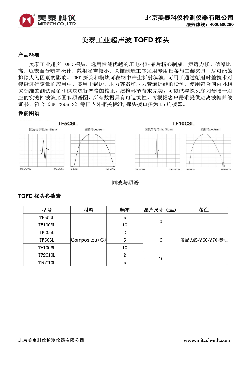美泰工業(yè)超聲TOFD探頭,選用性能優(yōu)越的壓電材料晶片精心制成,穿透力強、信噪比高,近表面分辨率極佳,散射噪聲較小。關(guān)鍵制造工序采用專用設(shè)備與工裝夾具,盡可能的排除人為因素的影響。TOFD探頭和楔塊可在鋼中產(chǎn)生折射縱波,可用于通過衍射時差技術(shù)對裂縫進行定量的應(yīng)用中,多用于鍋爐,壓力容器和壓力管道焊縫的檢測。使用符合國內(nèi)外相關(guān)標準的測試設(shè)備和試塊進行嚴格的校正,質(zhì)檢環(huán)節(jié)苛求完美,可提供與探頭序列號唯一對應(yīng)的實測回波波形圖和頻譜圖,所有數(shù)據(jù)具有可追溯性,可根據(jù)客戶需求提供距離波幅曲線證書,符合《EN12668-2》等國內(nèi)外相關(guān)標準,探頭接口多為L5連接器。