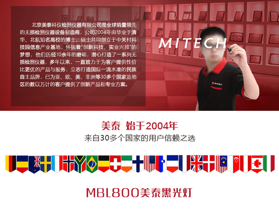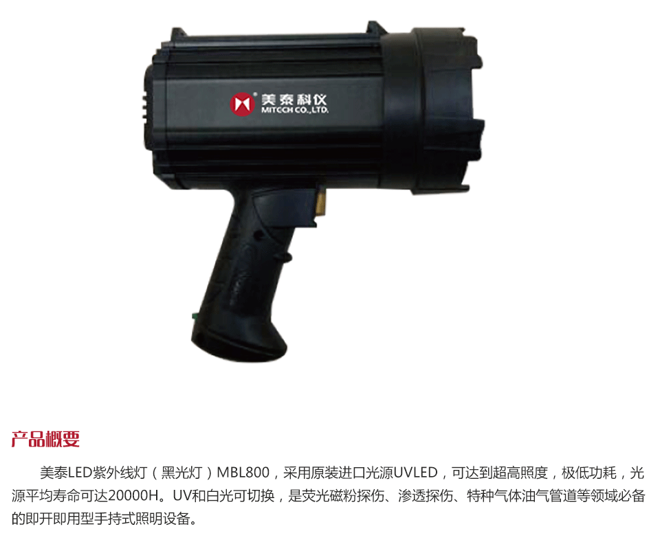 美泰LED紫外線燈(黑光燈)MBL800,采用原裝進口光源UVLED,可達到超高照度,極低功耗,光源平均壽命可達20000H。UV和白光可切換,是熒光磁粉探傷、滲透探傷、特種氣體、油氣管道等領域必備的即開即用型手持式照明設備。