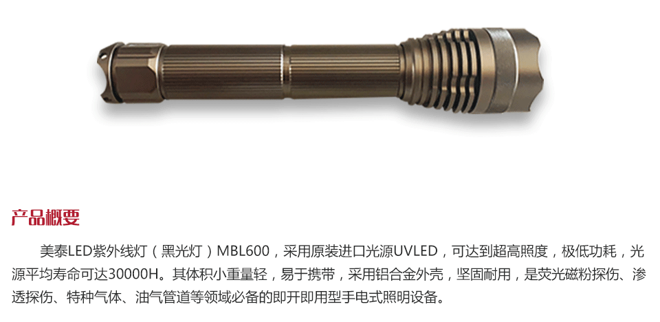 美泰LED紫外線燈(黑光燈)MBL600,采用原裝進(jìn)口光源UVLED,可達(dá)到超高照度,極低功耗,光源平均壽命可達(dá)30000H。其體積小重量輕,易于攜帶,采用鋁合金外殼,堅固耐用,是熒光磁粉探傷、滲透探傷、特種氣體、油氣管道等領(lǐng)域必備的即開即用型手電式照明設(shè)備。