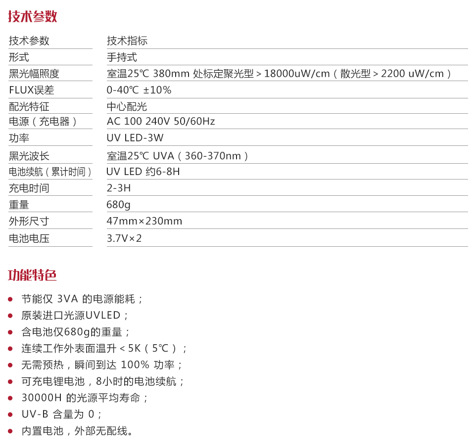 黑光幅照度 | 室溫25℃ 380mm 處標(biāo)定聚光型>18000uW/cm2 (散光型>2200 uW/cm2) |