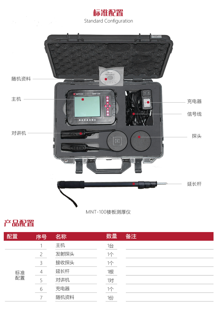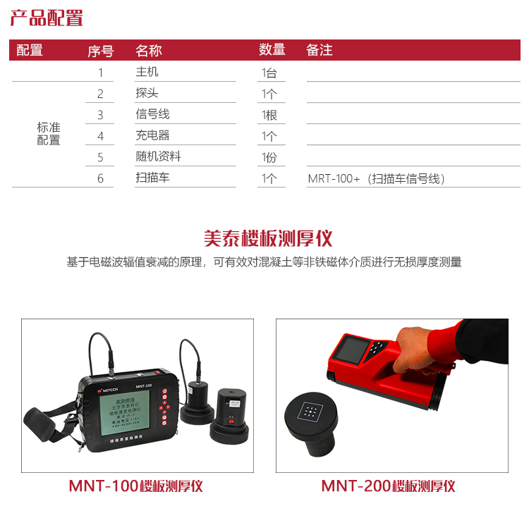 美泰MNT-100樓板測厚儀,基于電磁波幅值衰減的原理,可有效對混凝土等非鐵磁體介質(zhì)進(jìn)行無損厚度測量。其體積小、重量輕,易于攜帶,使用時,將發(fā)射探頭和接收探頭分別置于被測物體的兩相對測試面,依據(jù)接收信號,即刻測出厚度值。其測值速度快、測量精度高、性能穩(wěn)定可靠,被廣泛應(yīng)用于建筑施工質(zhì)量監(jiān)控檢測等領(lǐng)域,是保障生命財產(chǎn)安全必備的專業(yè)精密檢測儀器。