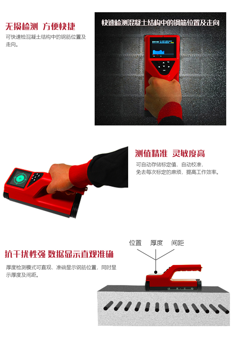 l 具有多重鋼筋檢測功能,通過提示條、黑色信號條、當前厚度值和信號值四種方式精確定位鋼筋;