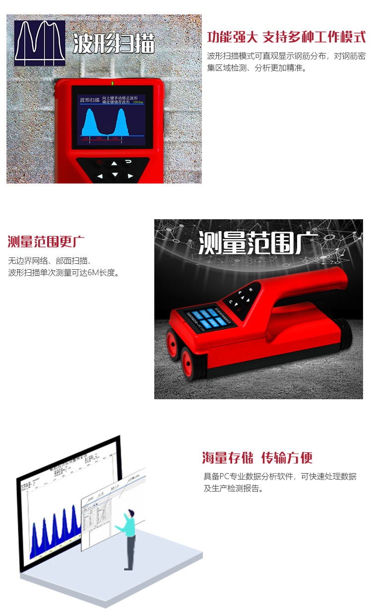 l 能夠準確的進行混凝土結構中鋼筋的定位、查看走向,測量保護層厚度及鋼筋直徑;