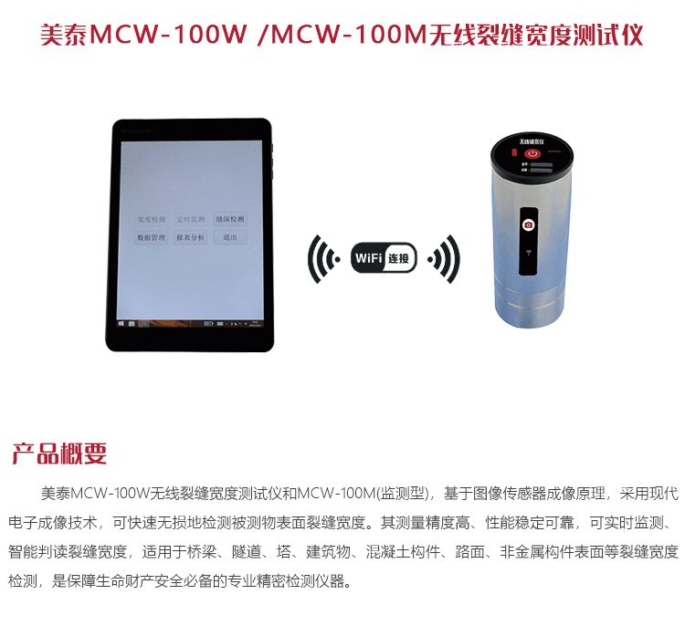 美泰MCW-100W無線裂縫寬度測試儀和MCW-100M(監(jiān)測型),基于圖像傳感器成像原理,采用現(xiàn)代電子成像技術(shù),可快速無損地檢測被測物表面裂縫寬度。其測量精度高、性能穩(wěn)定可靠,可實(shí)時(shí)監(jiān)測、智能判讀裂縫寬度,適用于橋梁、隧道、塔、建筑物、混凝土構(gòu)件、路面、非金屬構(gòu)件表面等裂縫寬度檢測,是保障生命財(cái)產(chǎn)安全必備的專業(yè)精密檢測儀器。