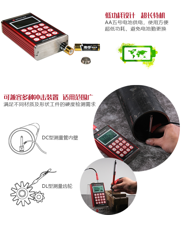 美泰便攜式里氏硬度計(jì)DC型沖擊裝置,高: 86 mm 重:50g 直徑:20mm,內(nèi)置DC型沖擊體,沖擊體的加載裝置設(shè)在沖擊裝置外部,DC型沖擊裝置體積小,適用于表面較光滑重量在5kg以上厚度5mm以上的狹小部位(孔內(nèi)、管內(nèi)壁)的工件硬度的測(cè)量。被廣泛的應(yīng)用于:已安裝的機(jī)械或永久性組裝的狹小部件;大型工件大范圍內(nèi)多處測(cè)量部位的快速檢驗(yàn);齒輪齒根等細(xì)長(zhǎng)窄槽或孔內(nèi)??蓪?shí)現(xiàn)里氏、布氏、洛氏等硬度的精確測(cè)量。 | |
